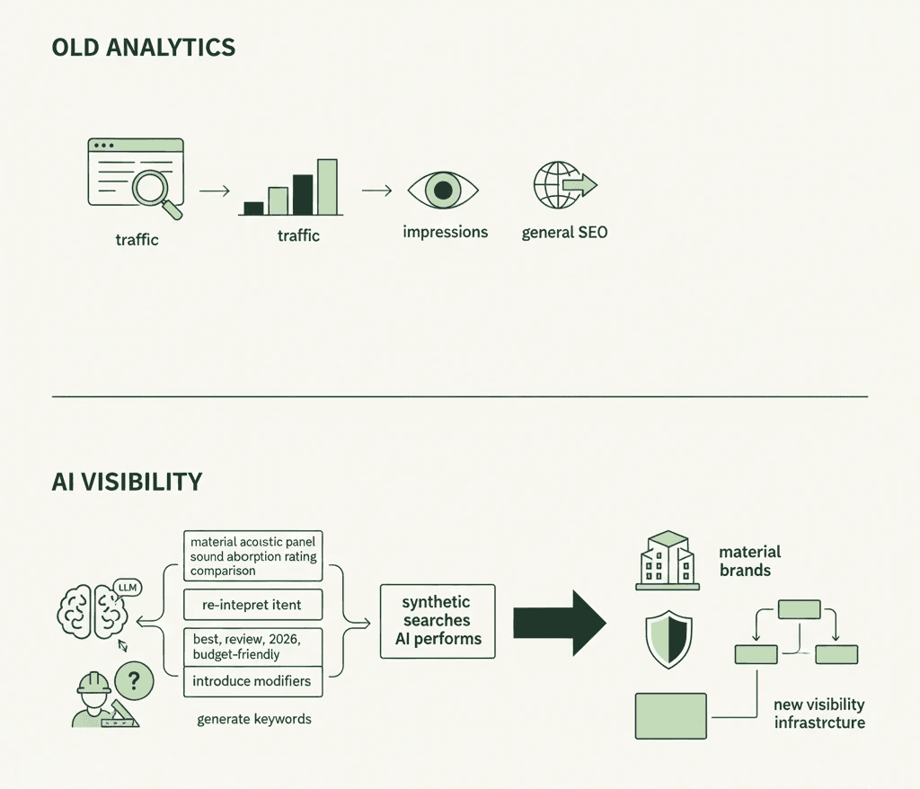 Material brands now compete not for human searches, but for the synthetic searches AI performs on behalf of architects. And that requires new visibility infrastructure. Old analytics focused on traffic, impressions, and general SEO. But AI visibility operates on different rules: